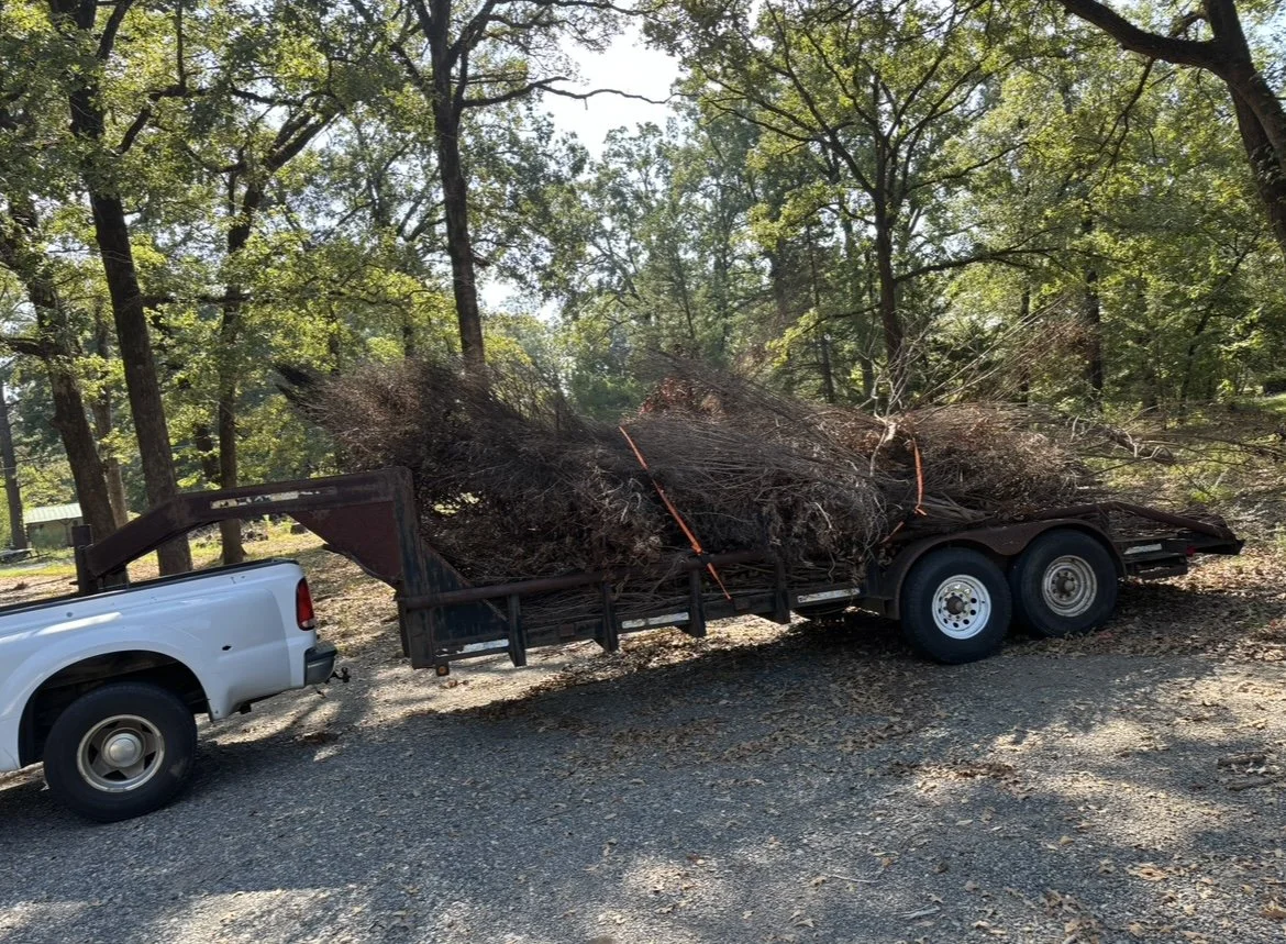 Photos from one of our trash and debris hauling jobs — including a full trailer load of brush and trees, along with the removal of an old vehicle from the property.